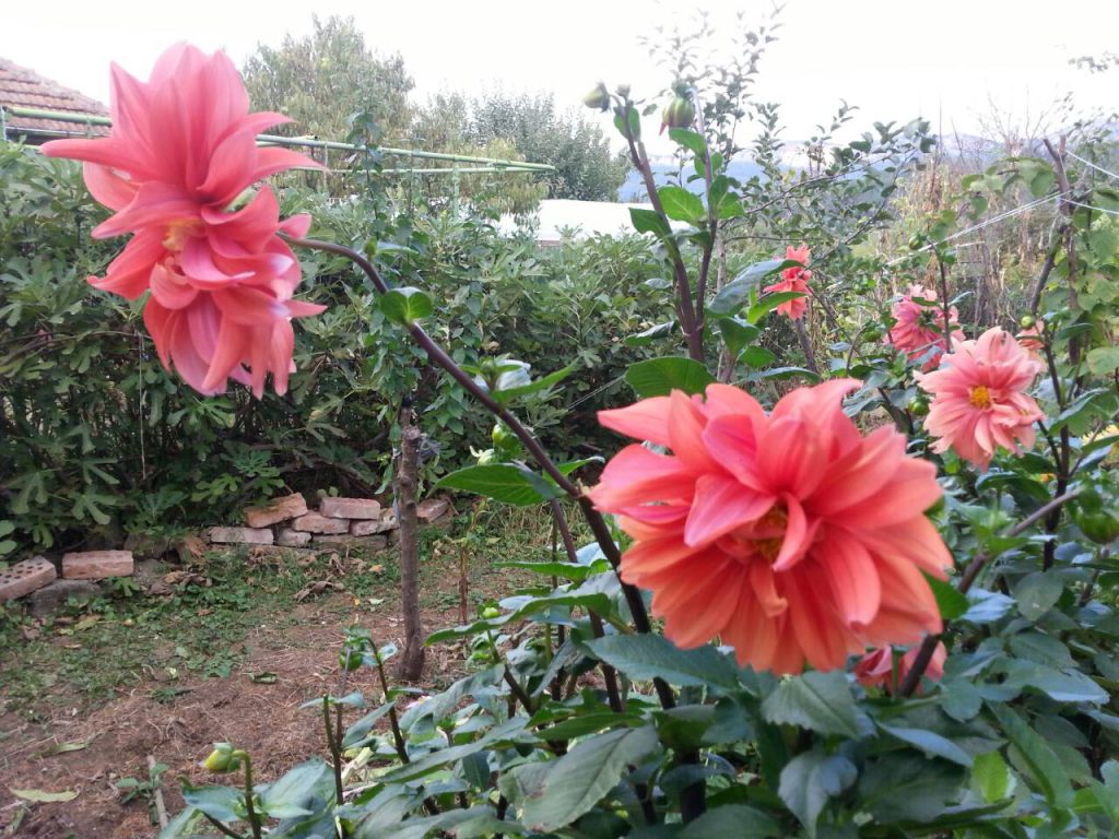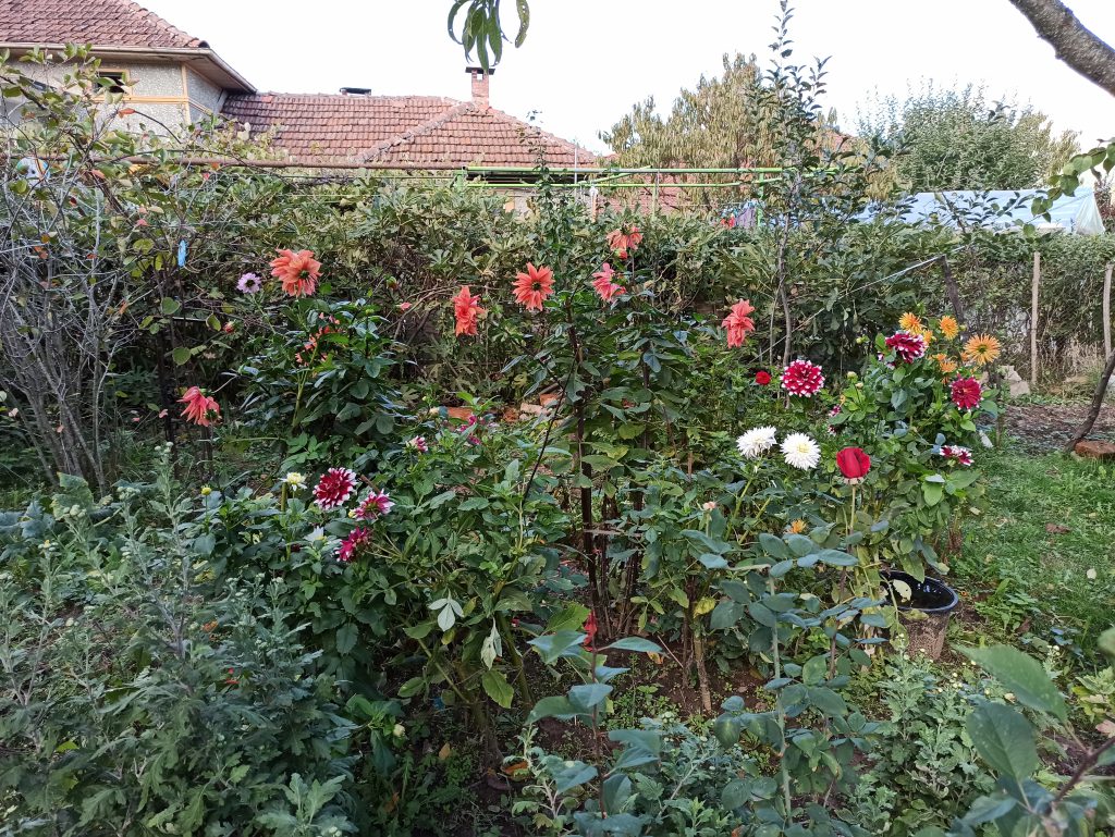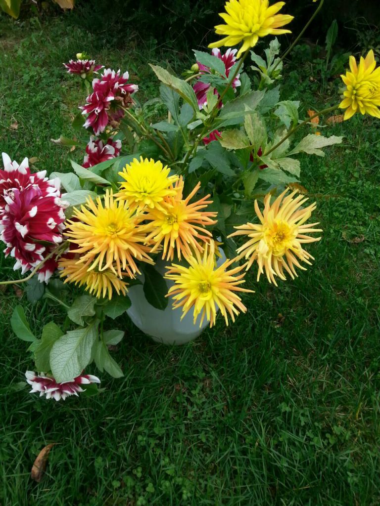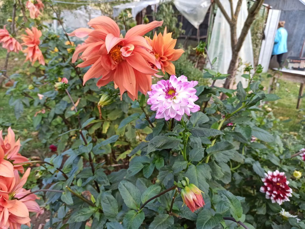 Денят е 26 октомври 2020, няколко малки слани са минали. Далиите все още са свежи, но ги извадихме и сортирахме. Сортовете са оранжево-жълта кактус далия, Duet, Little Robert, My Love (бяла), червена Pom pom далия.